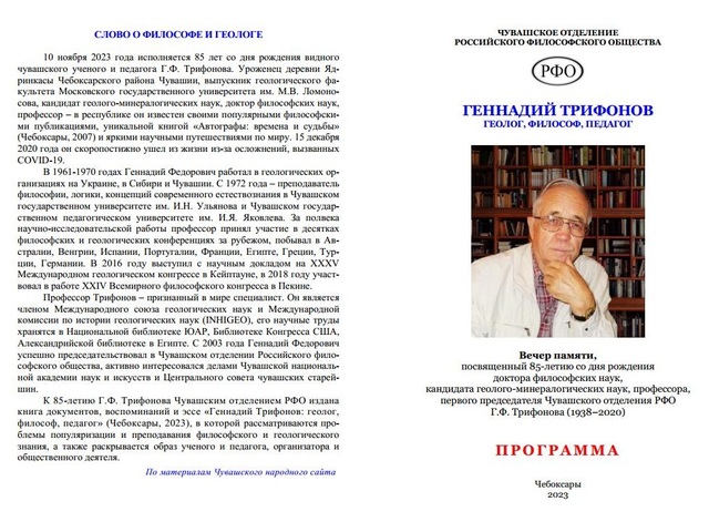 Чӑваш наци вулавӑшӗнче 2023 ҫулхи чӳк уйӑхӗн 10-мӗшӗнче чӑваш халӑхӗн шанчӑклӑ ывӑлӗ, геологӗ, философӗ, профессорӗ Геннадий Федорович Трифонов /1938-2020/ ҫуралнӑранпа 85 ҫул ҫитнине паллӑ турӗҫ. Унта философ пурнӑҫӗпе пултарулӑхӗ ҫинчен хӗрӗсемпе мӑнукӗсем, студентсем, ентешӗсемпе тӗпчевҫӗсем тухса калаҫрӗҫ, ятарласа кӑларнӑ кӗнекене хӑтларӗҫ.