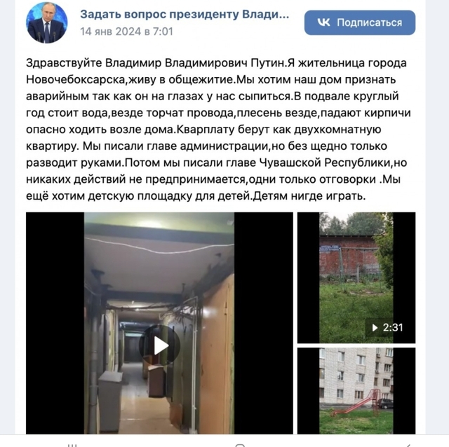 Ҫӗнӗ Шупашкарти общежитисенчен пӗри ишӗлме тытӑннӑ. Кун пирки унта сакӑр ҫул пурӑнакан хӗрарӑм тӗнче тетелӗнче виҫӗ видео вырнаҫтарнӑ. Вӑл ҫӗршыв Президенчӗ Владимир Путин тӳрӗ эфир ирттернӗ чухне ҫыру та ҫырса янӑ. Ҫурт маччи тата кирпӗч стенасем ишӗлеҫҫӗ, стенасем кӑвакарса ларнӑ, электропӑралук япӑхса кайнӑ иккен. Тӗрлӗ инстанцие ҫӑхавланин усси пулман-мӗн.