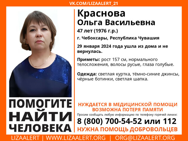 Шупашкар хулинче 47 ҫулти хӗрарӑма шыранӑ. Кун пирки «Лиза Алерт» шырав ушкӑнӗ хыпарланӑ. Ольга Краснова килтен кӑрлач уйӑхӗн 29-мӗшӗнче тухса кайнӑ иккен, каялла таврӑнман. Ҫавӑн хыҫҫӑн унӑн ҫывӑх ҫыннисем сисчӗвленсе ӳкнӗ.