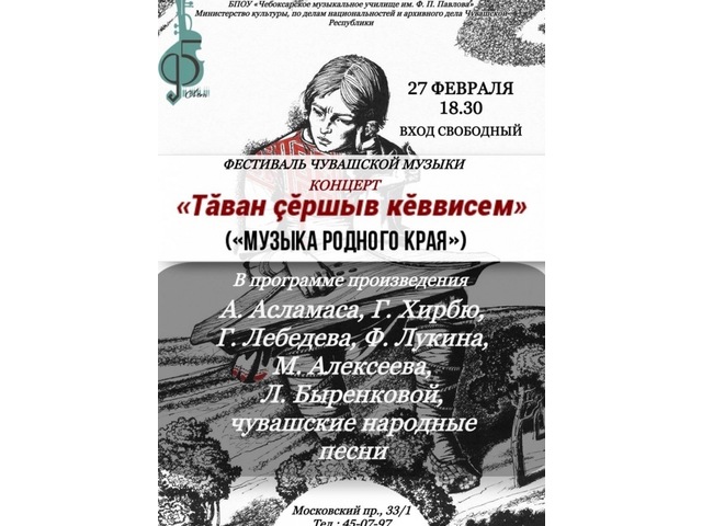 Нарӑс уйӑхӗн 27-мӗшӗнче Чӑваш музыка училищин пысӑк концерт залӗнче «Тӑван ҫӗршыв кӗввисем» концерт иртӗ. Ун вӑхӑтӗнче паллӑ чӑваш композиторӗсен Анисим Асламасӑн, Герман Лебедевӑн, Гигорий Хирпӳн, Филипп Лукинӑн, Михаил Алексеевӑн, Лариса Быренкован хайлавӗсем татат чӑваш халӑх юррисем янӑрӗҫ.