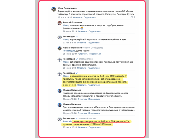 «Контактра» халӑх тетелӗнчи Росавтодорӑн ушкӑнӗнче пост айӗнче кун пирки ыйту пулнӑ. Ҫапларах хуравланӑ: М-7 ҫулӑн 642-659 ҫухрӑмӗсене 2029-2033 ҫулсенче реконструкцилеме пӑхса хӑварнӑ.