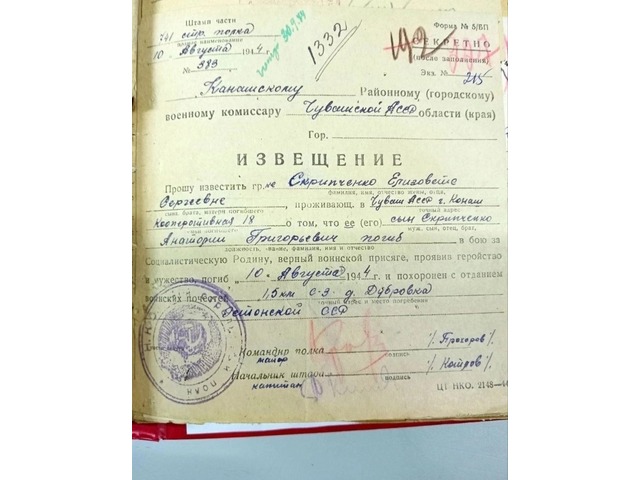 Скрипченко Анатолий Григорьевич 1944 ҫулта хыпарсӑр ҫухалнӑ. Вӑл Ленинград тата 3-мӗш Прибалтика фрончӗсенчен ҫапӑҫнӑ. 1944 ҫулта 128-мӗш дивизи Псков облаҫне ирӗке кӑларнӑ ҫӗре хутшӑннӑ. Архив даннӑйӗсем тӑрӑх, дивизи нумай салтака ҫухатнӑ.
