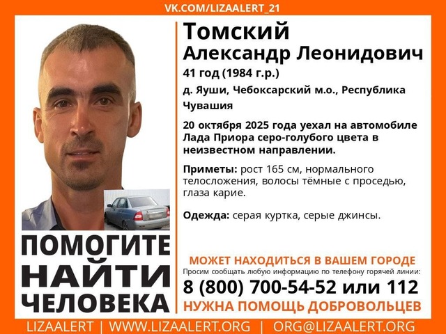 41 ҫулти Александр Леонидович Томский килтен юпа уйӑхӗн 20-мӗшӗнче «Лада Приора» машинӑпа тухса кайнӑ. Явӑш арҫынни хӑй ӑҫта ҫул тытнине килтисене пӗлтермен.
