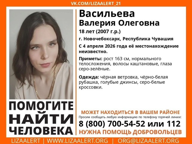 Ҫӗнӗ Шупашкарта ака уйӑхӗн 4-мӗшӗнченпе 18 ҫулти хӗре шыраҫҫӗ. «Лиза Алерт» шыравпа ҫӑлав служби пулӑшу ыйтать.