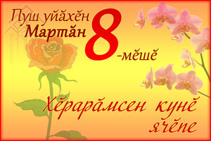 Юратнӑ хӗрарӑмсем! Ҫуркуннехи ҫак ҫутӑ та савӑк уяв кунӗнче ырӑ кӑмӑлӑршӑн, чун тараватлӑхӗшӗн, пирӗн пурнӑҫа ҫутӑрӑх та хӑтлӑрах тата илемлӗрех тума пӗлнӗшӗн чӗререн тухакан тав сӑмахӗсене йышӑнсамӑр!