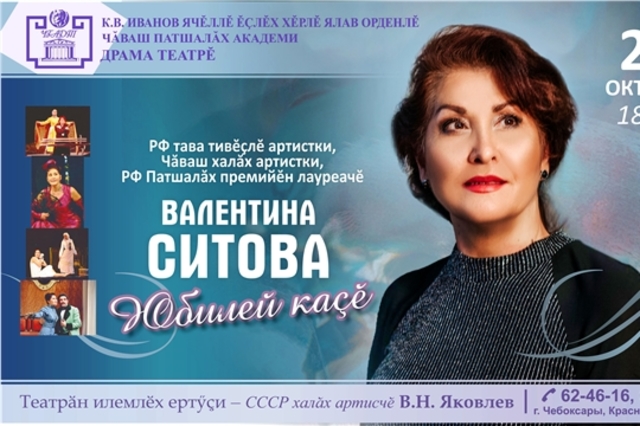 Юпа уйӑхӗн 24-мӗшӗнче Раҫсей Федерацийӗн тава тивӗҫлӗ артисткин, Чӑваш Республикин халӑх артисткин, Раҫҫейӗн Патшалӑх премийӗн лауреачӗн Валентина Ситовӑн юбилей каҫне йыхравлаҫҫӗ. Уяв К.В. Иванов ячӗллӗ Чӑваш патшалӑх академи драма театрӗнче 18 сехетре пуҫланӗ.