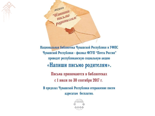 Чӑваш Енӗн Наци вулавӑшӗ Раҫҫей пуштин Чӑваш Енри филиалӗпе пӗрле «Напиши письмо родителям» (чӑв. Аҫӑр-аннӗр патне ҫыру ҫырӑр) ятпа социаллӑ акци ирттерет.