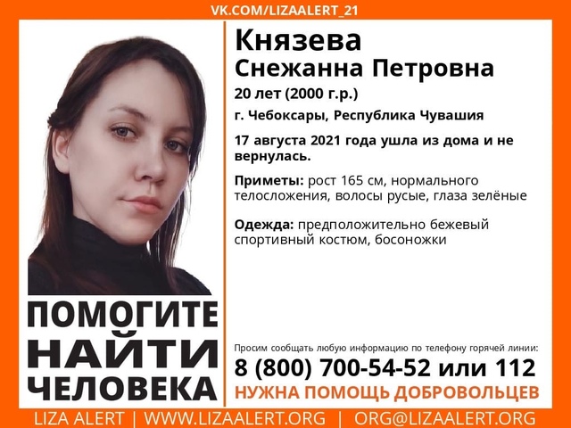 Шупашкарта Снежанна Князевӑна шыраҫҫӗ. Вӑл 20 ҫулта. Хӗр ҫурла уйӑхӗн 17-мӗшӗнче каҫхине килтен тухса кайнӑ та таврӑнман.