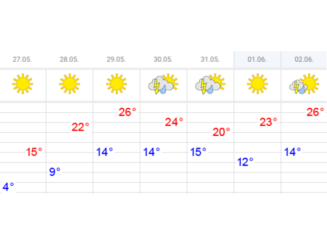 Ыран, ытларикун, кӑнтӑрла 20 градус таран ӑшӑтӗ, анчах ҫил вӑйланӗ. Юнкунран ҫуллахи пек ӑшӑ пуҫланӗ, кӑнтӑрла сывлӑш 20-25 градус таран ӑшӑнӗ, ҫӗрле – 10-15 градус таран. Ҫу уйӑхӗн 30-31-мӗшӗсенче вырӑнӑн-вырӑнӑн аслатиллӗ ҫумӑр ҫӑвӗ.